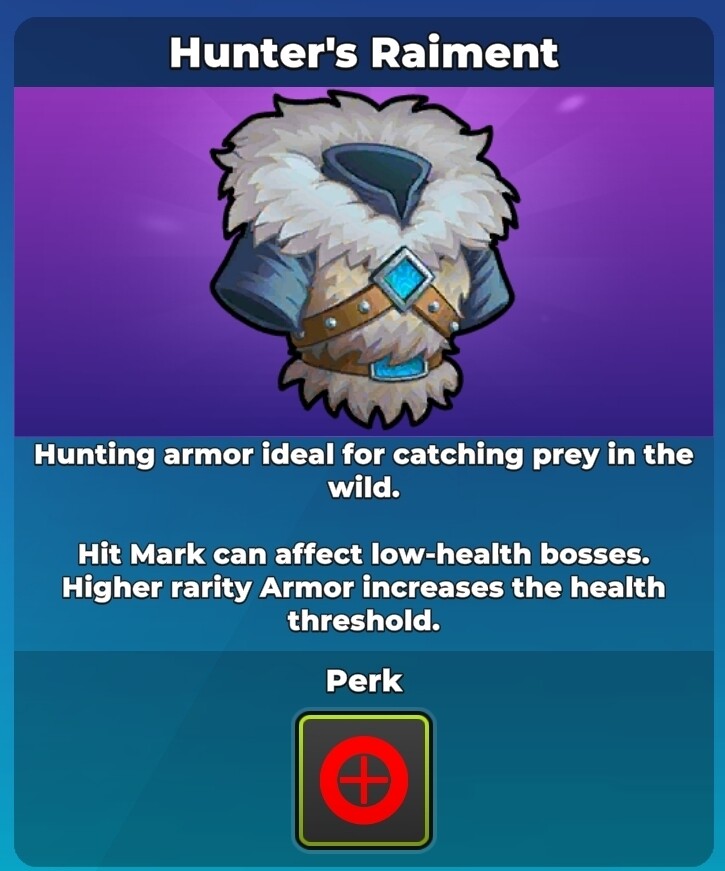 Released in update 4.3.0, Hunter’s Raiment is an armor piece that come with the hit mark perk. It functions the same as the normal perk, but also works on low health bosses.